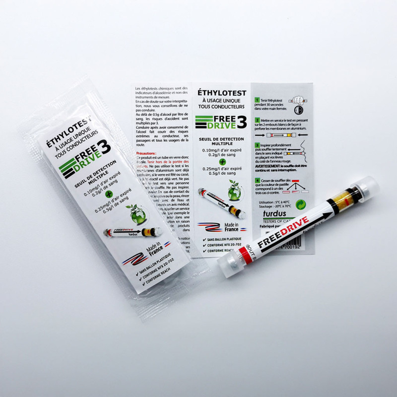 Cet éthylotest normes NFX est composé d'un réactif chimique avec embout buccal et un sachet de traçabilité.