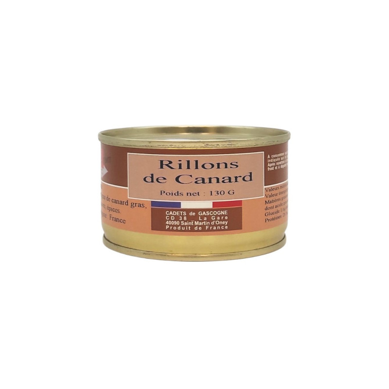 Distributeur : Les Cadets de Gascogne Région: Saint‑Martin‑d’Oney, Landes (Sud-Ouest de la France) Producteur : Foie Gras de Chalosse – coopérative d’éleveurs - Montfort-en-Chalosse, Landes. Ingrédients : Viande maigre et gras de canard, ail, sel, poivre, épices. Allergènes : Peut contenir des traces de sulfites. Conditionnement : Boîte métallique de 130g. Les rillons de canard allient la tendreté de la viande maigre et la richesse du gras de canard, relevés d’une pointe d’ail, pour une dégustation gourmande et authentique. Accords & utilisation : À savourer en entrée ou apéritif, sur pain grillé ou accompagné d’une salade verte. Accompagne parfaitement un vin rouge du Sud-Ouest ou un rosé fruité.
